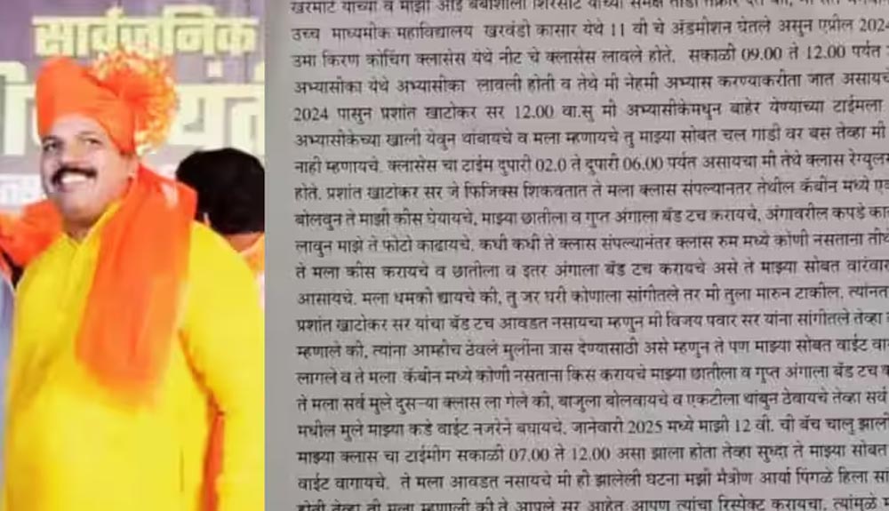 पीडित मुलीकडून पोलिसांकडे देण्यात आलेल्या तक्रारीत म्हटले आहे की, ‘मी संत भगवान बाबा उच्च माध्यमिक महाविद्यालय खरवंडी कासार येथे 11 वीचे अॅडमीशन घेतले असून एप्रील 2024 मध्ये उमा किरण कोचिंग क्लासेस येथे नीटचे क्लासेस लावले होते. सकाळी 09.00 ते 12.00 पर्यंत उज्वल अभ्यासिका येथे अभ्यासीका लावली होती व तेथे मी नेहमी अभ्यास करण्याकरीता जात असायचे. जुलै 2024 पासून प्रशांत खाटोकर सर 12.00 वा.सु मी अभ्यासीकेमधुन बाहेर येण्याच्या टाईमला माझ्या अभ्यासीकेच्या खाली येवून थांबायचे व मला म्हणायचे तू माझ्यासोबत चल गाडीवर बस, तेव्हा मी त्याला नाही म्हणायचे. क्लासेसचा टाईम दुपारी 2 ते दुपारी 6 पर्यंत असायचा. मी तेथे क्लास रेग्युलर करत होते. प्रशांत खाटोकर सर जे फिजिक्स शिकवतात ते मला क्लास संपल्यानतर तेथील केबिनमध्ये एकटीला बोलवून ते माझा कीस घ्यायचे, माझ्या छातीला व गुप्त अंगाला बॅड टच करायचे. अंगावरील कपडे काढायला लावून माझे ते फोटो काढायचे. कधी कधी ते क्लास संपल्यानंतर क्लासरुम मध्ये कोणी नसताना तिथे सुध्दा ते मला किस करायचे व छातीला व इतर अंगाला बॅड टच करायचे. ते असे माझ्यासोबत वारंवार करत असायचे. मला धमकी द्यायचे की, तू जर घरी कोणाला सांगितले तर मी तुला मारुन टाकेन, अशी धमकी प्रशांत खाटोकर यांनी आपल्याला दिल्याचे तक्रारीत म्हटले आहे.’