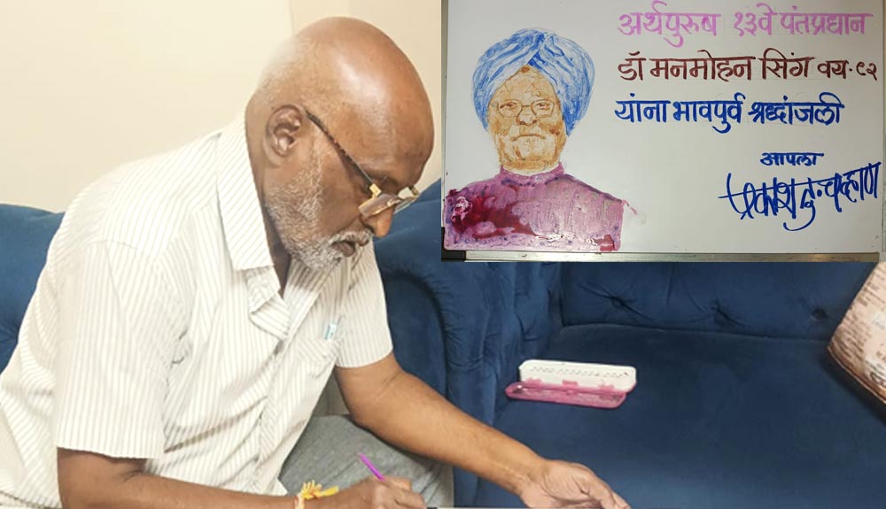 पुणे (संदिप कद्रे): पुणे शहरातील सेवानिवृत्त पोलिस उपनिरीक्षक प्रकाश चव्हाण यांनी आपल्या अनोख्या शैलीतून देशाचे माजी पंतप्रधान दिवंगत डॉ. मनमोहन सिंग यांना श्रद्धांजली अर्पण केली. चित्रकला व लेखन यांची आवड असणारे चव्हाण यांनी दिवंगत डॉ. मनमोहन सिंग यांचे स्वतः चित्र साकारून ही अनोख्या पद्धतीने श्रध्दांजली अर्पण केली आहे.